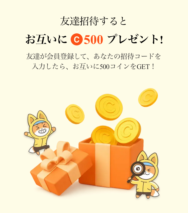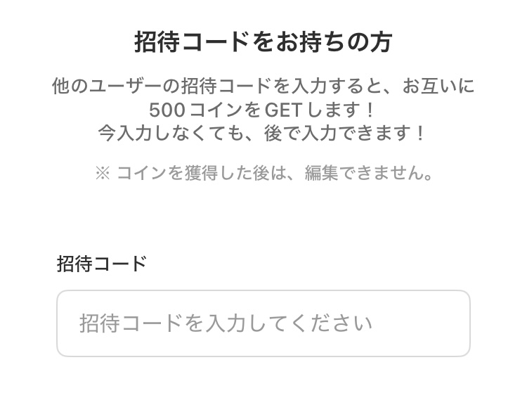 招待コードを入力することで、500コイン(125円相当)もらえ少しだけお得に始めることができます。