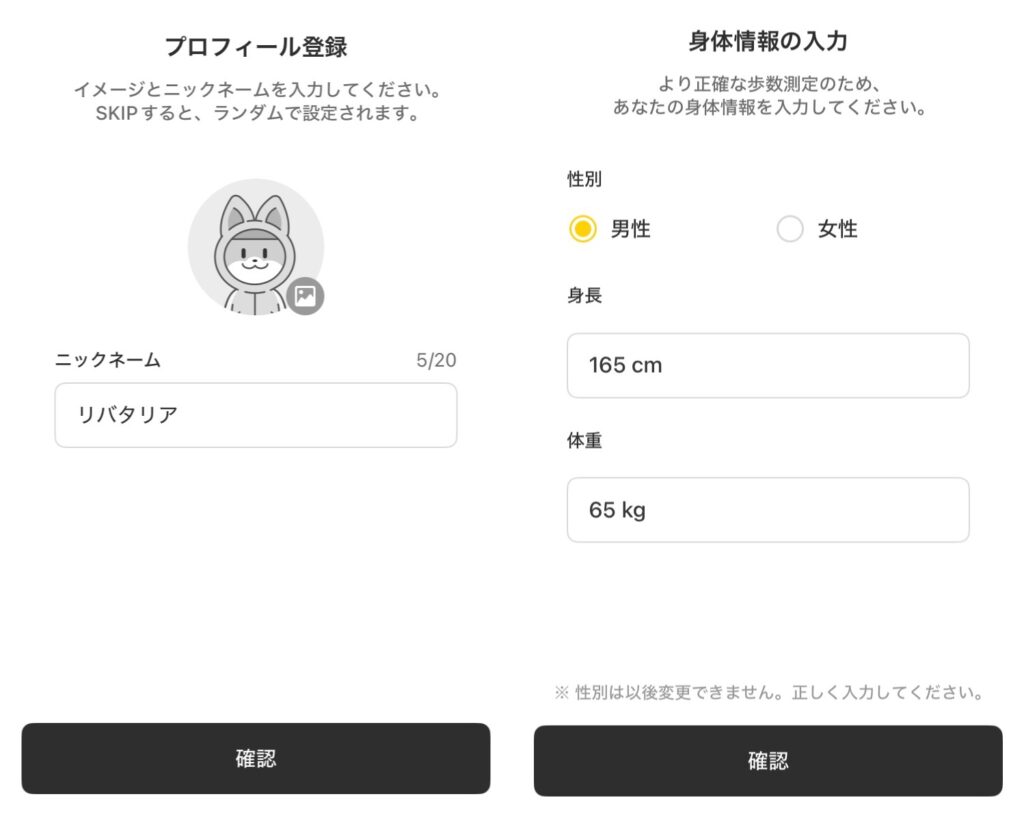 ニックネーム、性別、身長、体重を入力します。