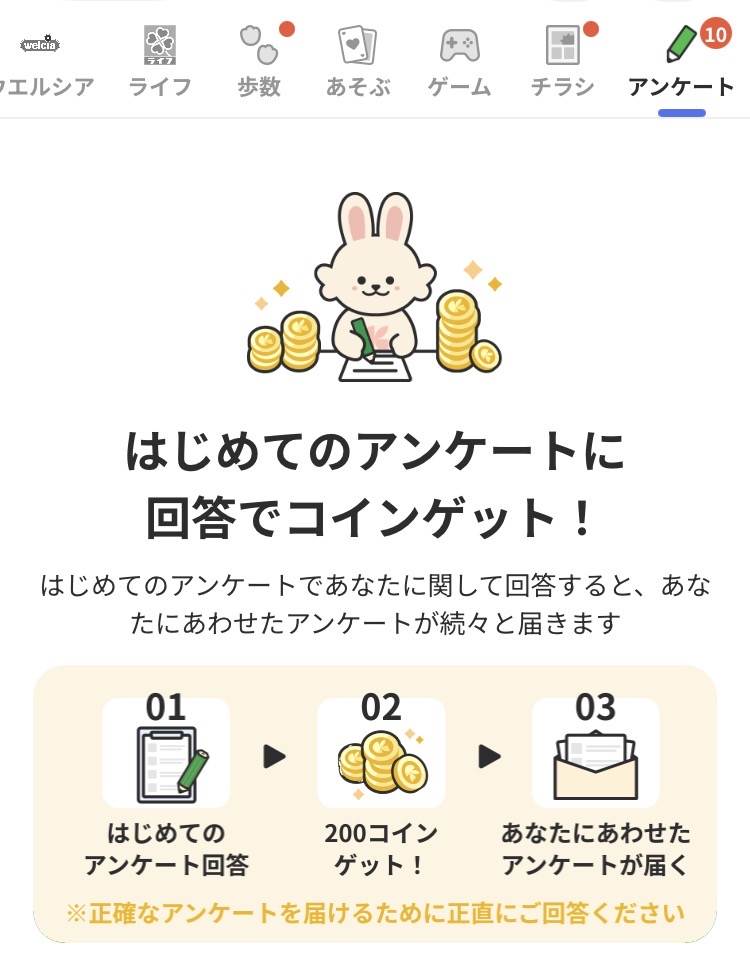 「あなたに関するアンケート」に回答するだけでも200コインは獲得できますので、時間があるときに回答しておきましょう。