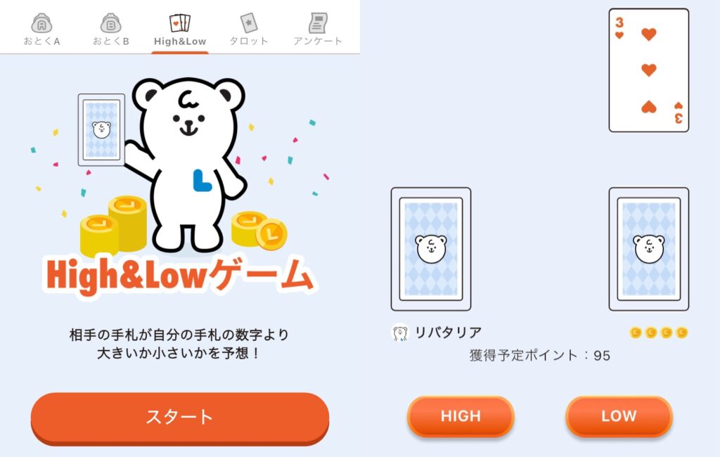 トランプのHigh&Lowゲームで、相手のカードより数字が大きいか小さいかを予想します。