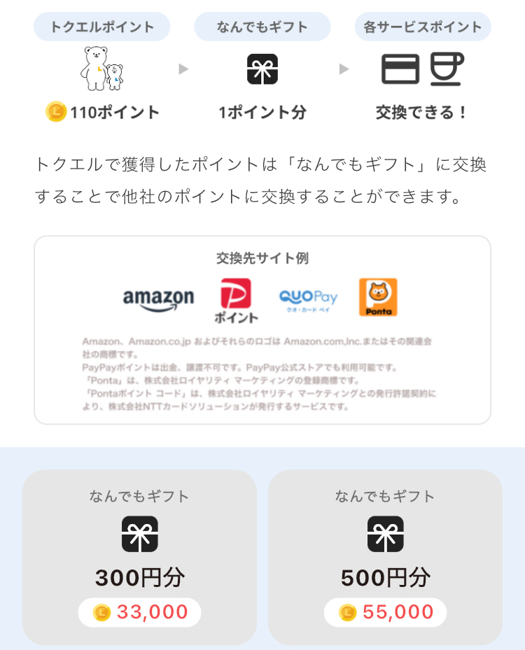 「トクエル」で獲得したポイントは、「なんでもギフト」に交換できます。