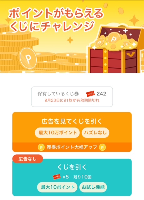 アプリホーム画面の「ポイントくじを引く」もしくは右上の「チケット」からくじに挑戦できます。