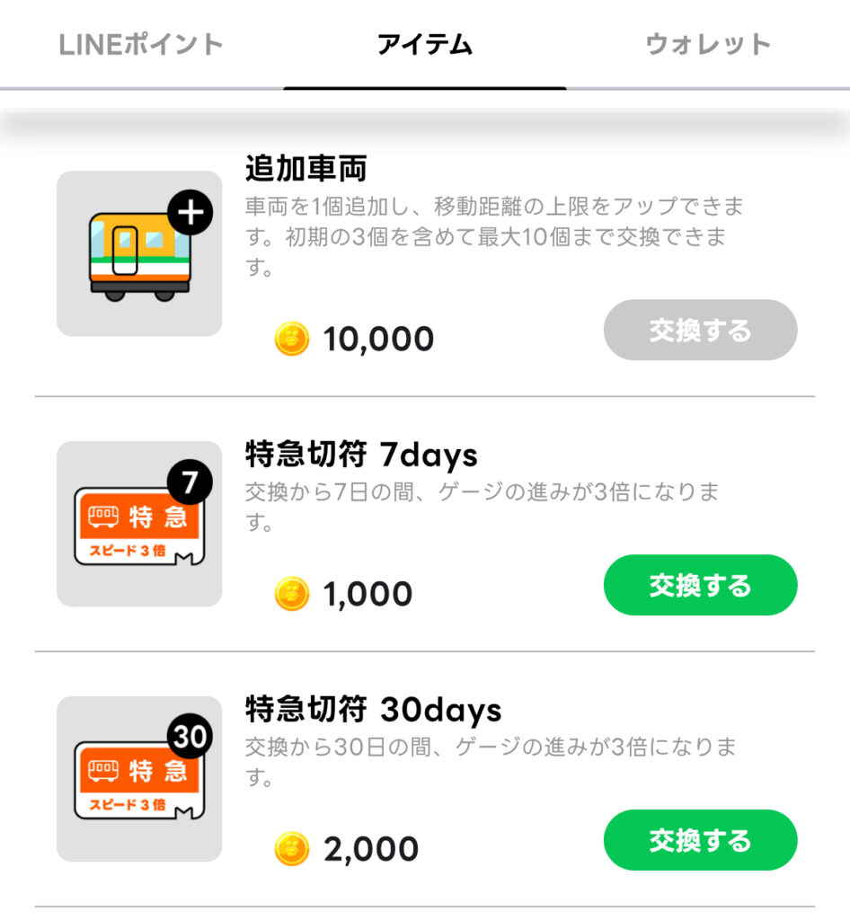 交換することで歩数ボーナスなどが得られ、結果的に今後のコインをより効率よく貯められるようになります。