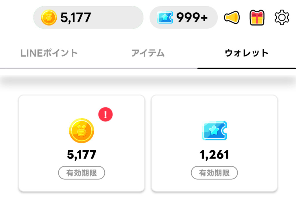 もし、1か月以内に有効期限を迎えるチケットやコインがある場合は、「!」マークが表示されます。