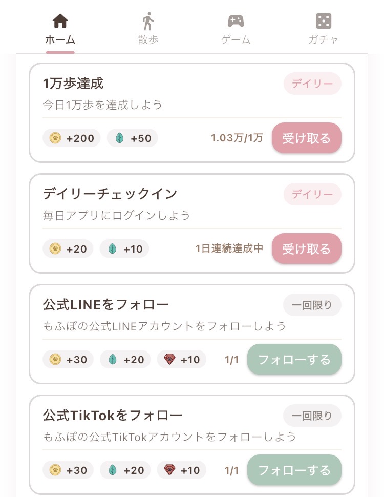 ミッション達成でポイントや葉っぱ、もふジェムを獲得できます。