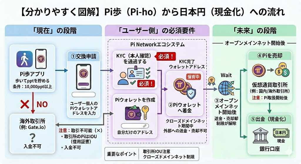 ⚠️ 絶対に注意してほしいこと 交換先は、必ず「自分専用のPiウォレット(お財布)」を指定してください。 海外の仮想通貨取引所(Gate.ioなど)へ直接送ることはできません。