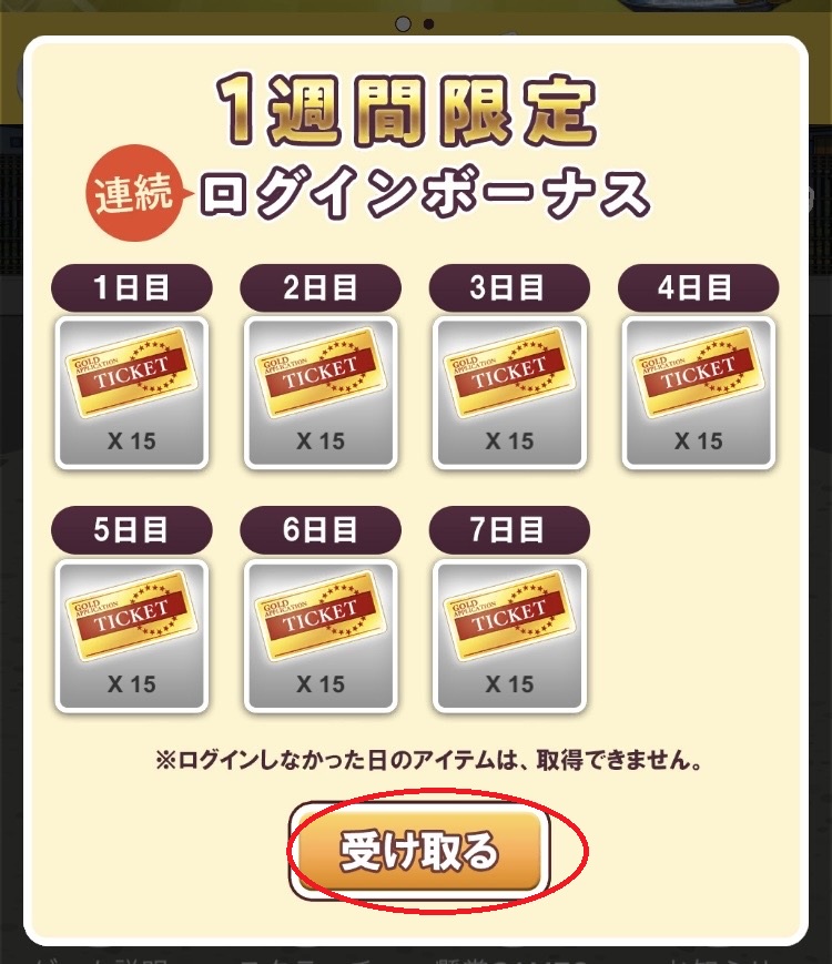 「受け取る」をタップして、1週間限定のログインボーナスを獲得します。