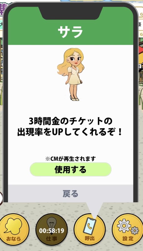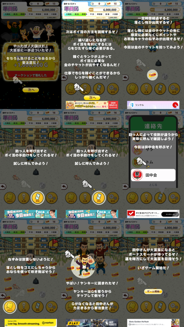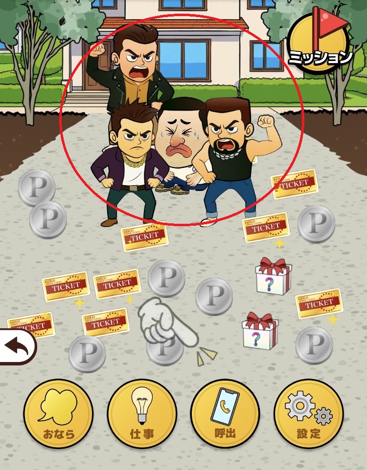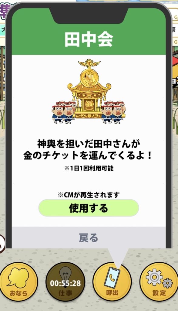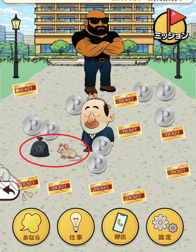 - ② 完全放置はNG!定期的なログインが必要 放置ゲームとはいえ、長時間放置しすぎるとお邪魔キャラ(ねずみ・ヤンキー)にせっかくの金のチケットを奪われたり、効率を下げられたりしてしまいます。お助けアイテムを使わない場合は、数時間に1回はアプリを開いて田中さんの様子を見にいく(タップする)手間が発生します。