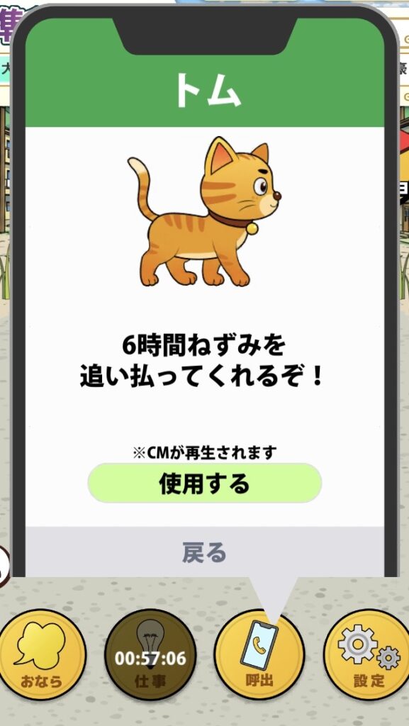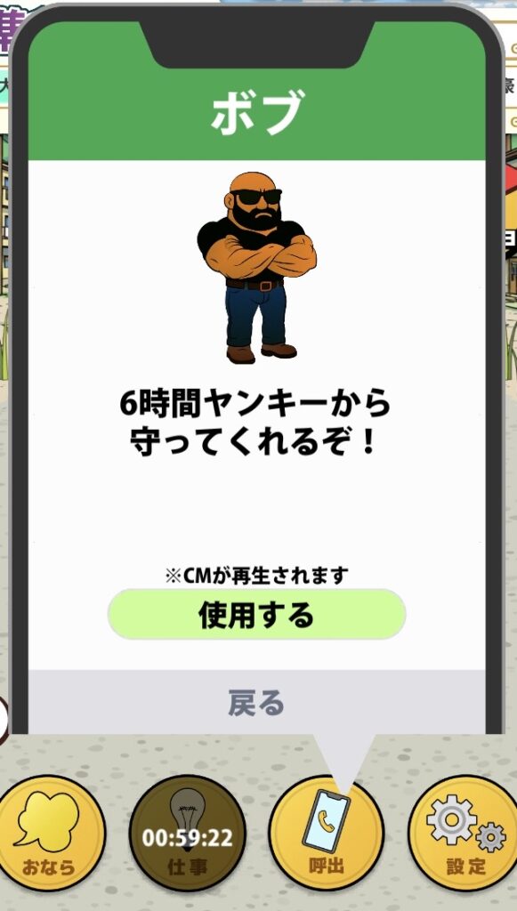 アプリ下部の「呼出」をタップして、「ボブ」や「トム」といった助っ人を使用すると、一定時間自動でお邪魔キャラを追い払ってくれます。