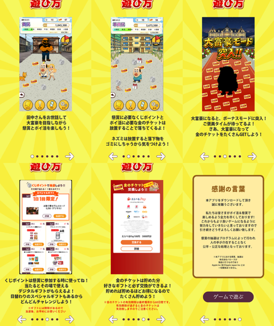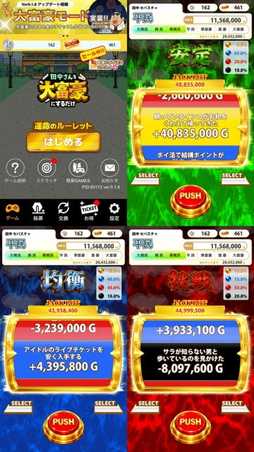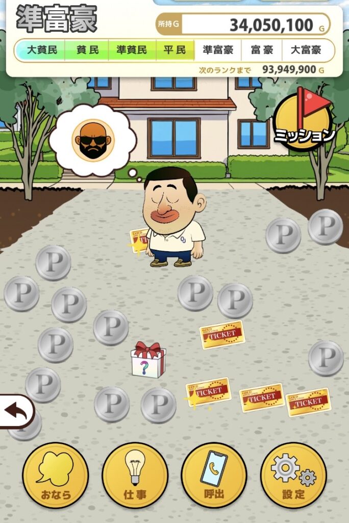「仕事をする」や「運命のルーレットを回す」などでGを貯めて大富豪を目指しながら、「金のチケット」や「くじポイント」を獲得していきます!