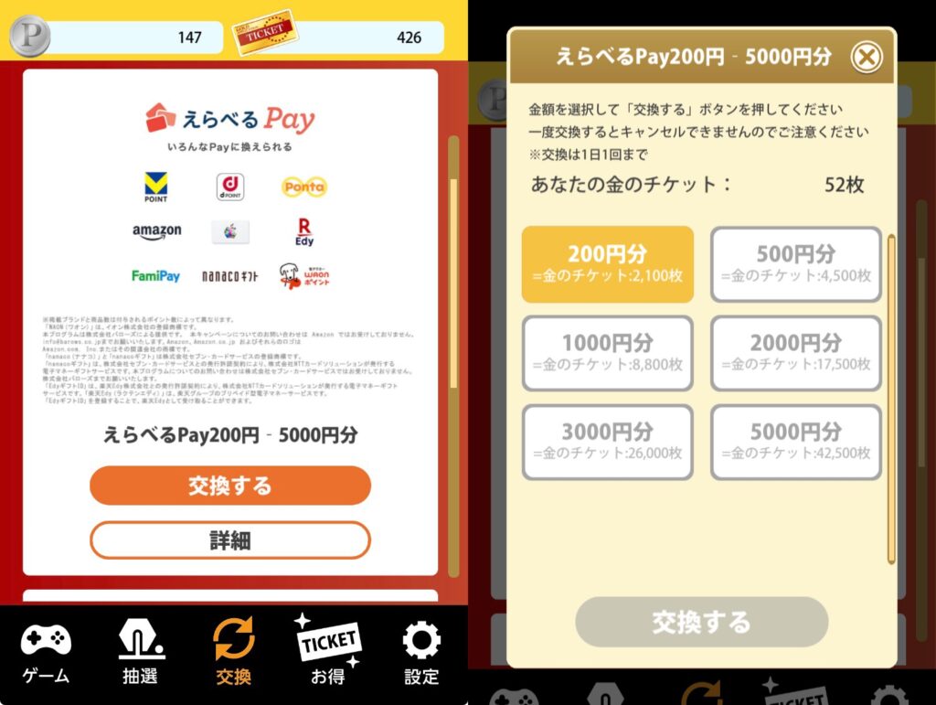 ・貯めた金のチケットは、「えらべるPay」を経由して好みの他社ポイントへ!